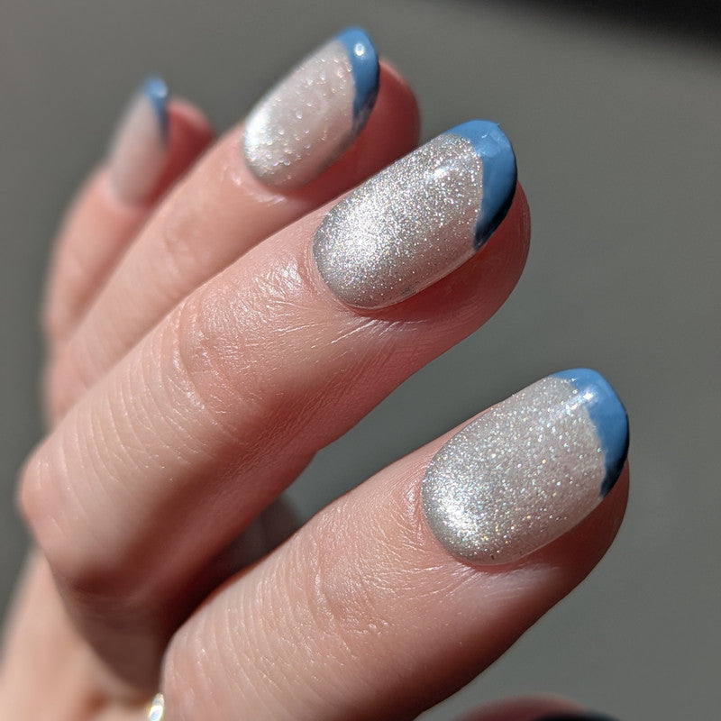 透明感のあるシルバーマグネットにブルーのフレンチラインを重ねた、奥行きのあるネイルチップです。