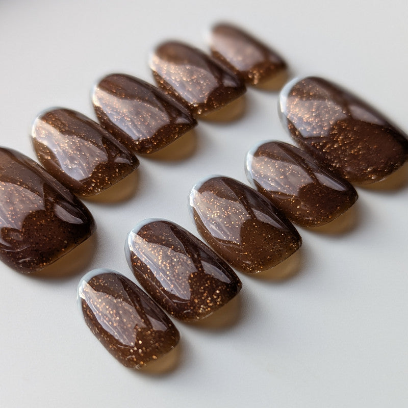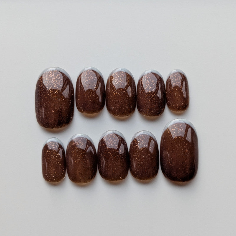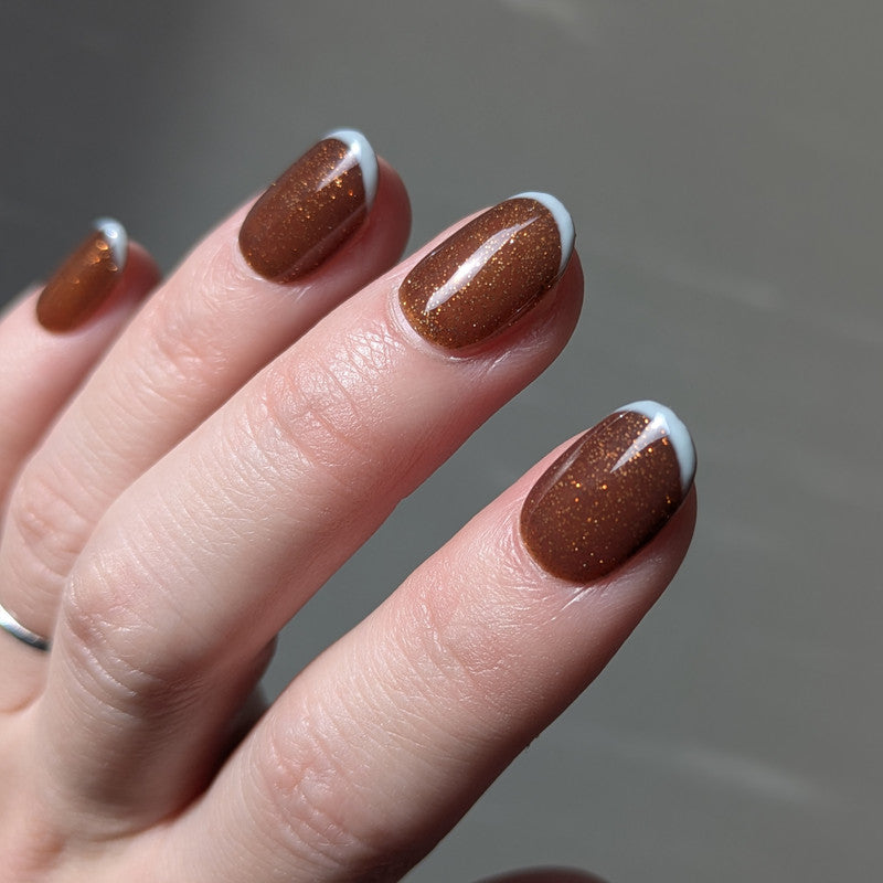 ブラウンのラメベースに淡いブルーのフレンチラインのネイルチップです。