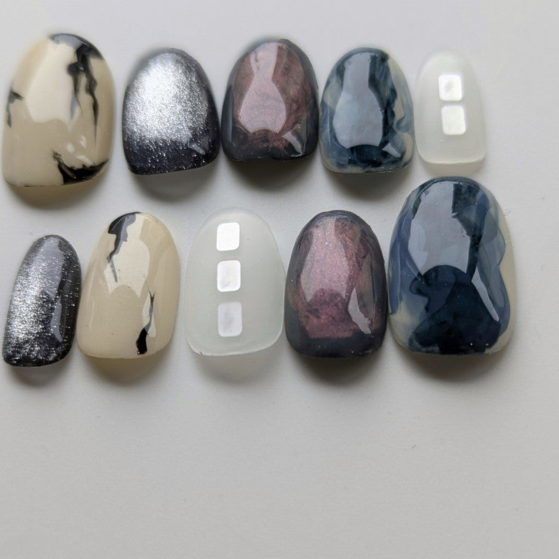 深みのあるパープルとブラックマーブルが織りなす、しっとりとした艶と静けさを感じるデザインのネイルチップです。