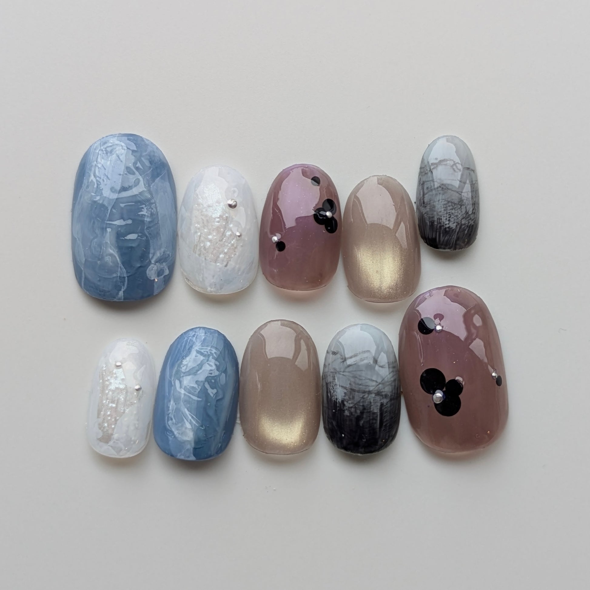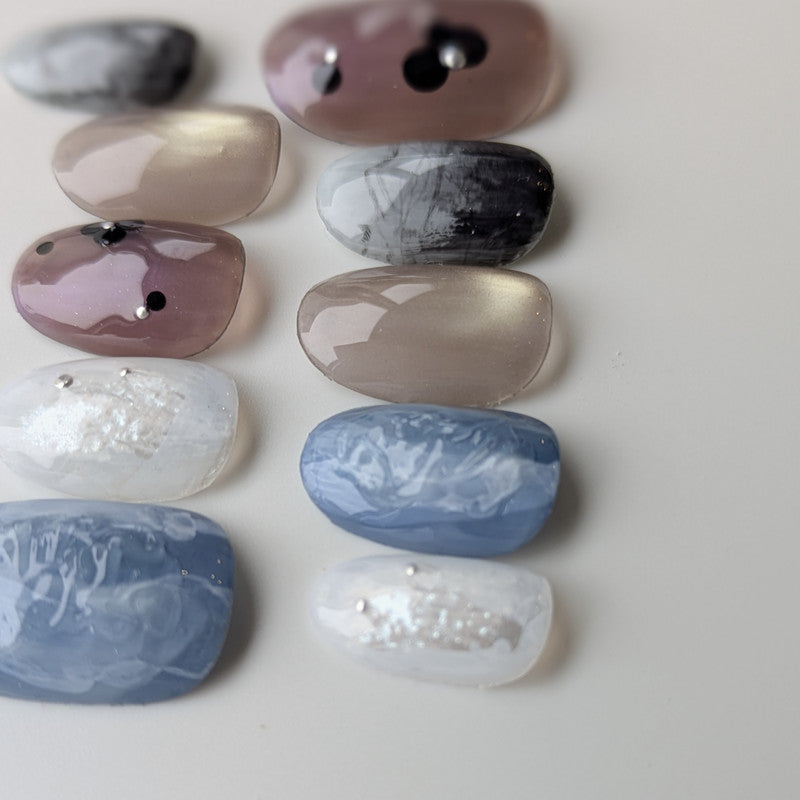 ブルーグレーとモーブブラウンをベースに、ほんのり光を宿したキャットアイと透け感のあるアートのネイルチップです。